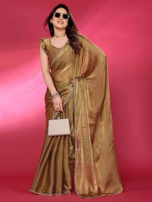 This Gold chiffon saree is designed with a delicate beaded border that adds subtle charm and elegance to its solid base. The lightweight chiffon fabric ensures a graceful drape, while the included unstitched satin blouse piece allows you to customize the look to your preference. Perfect for parties, festive gatherings, and special events, this saree blends simplicity with a touch of refined embellishment, making it a versatile choice for modern occasions.