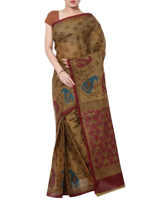 Very fine quality of Cotton jute fabric based beautiful floral print saree, has a contrast color border with a colorful printed blouse piece.
