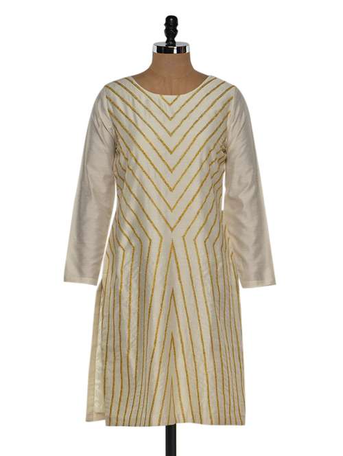 - » solid cream long kurta with gold embroidery