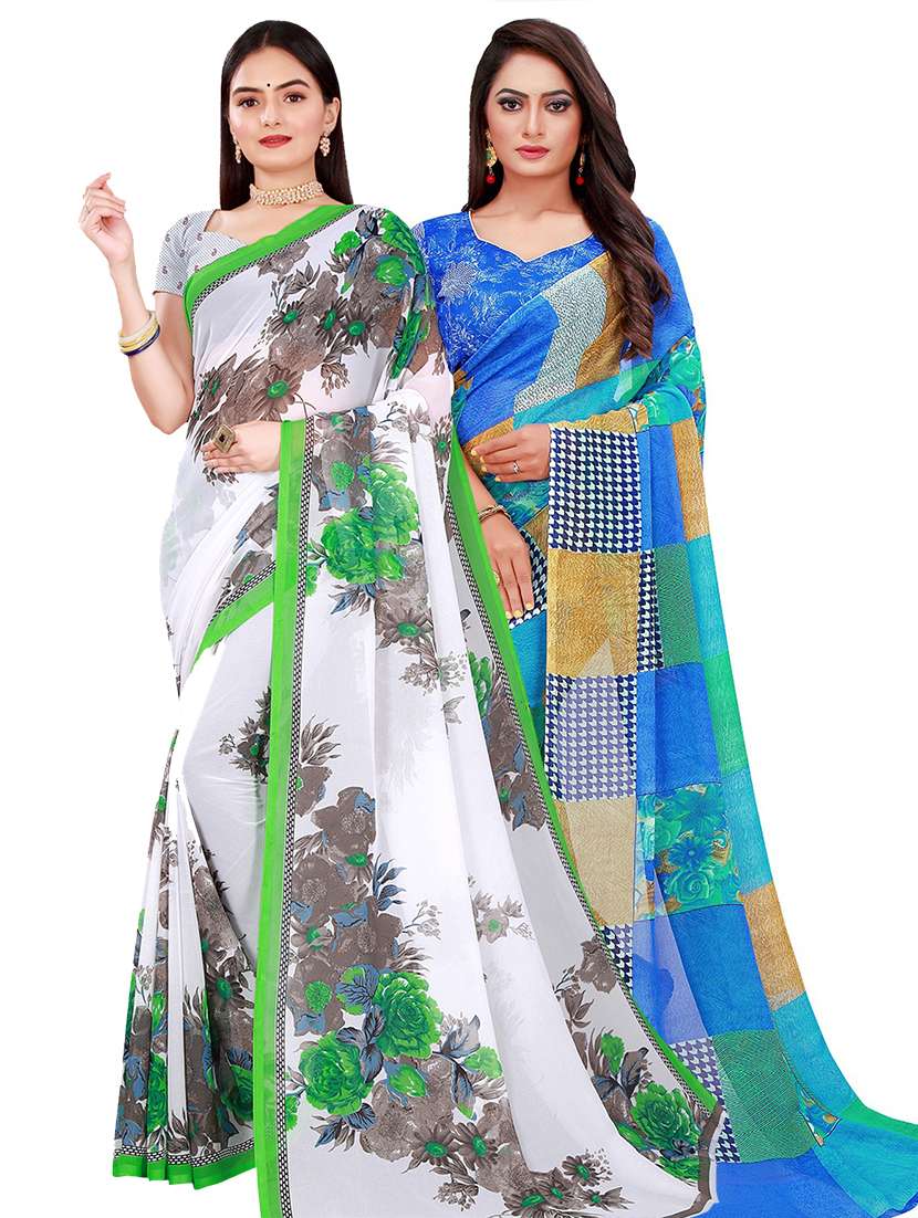 Be the cynosure of all eyes wearing this multi coloured Printed sarees from the house of Florence. Made of Georgette, this saree will keep you comfortable throughout the day. The fine Work enhances the visual appeal of this Combo saree. each saree measures 5.5 m and it comes with a 0.80 m blouse piece.