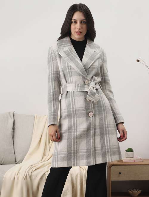 - » globus women cream notched lapel long sleeves checkered self design winter wear overcoat with belt