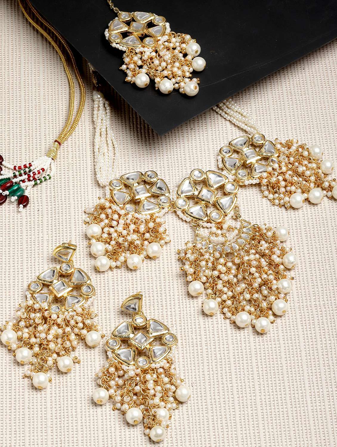- » gold plated handcrafted pearl floral kundan necklace earring and maang tikka set