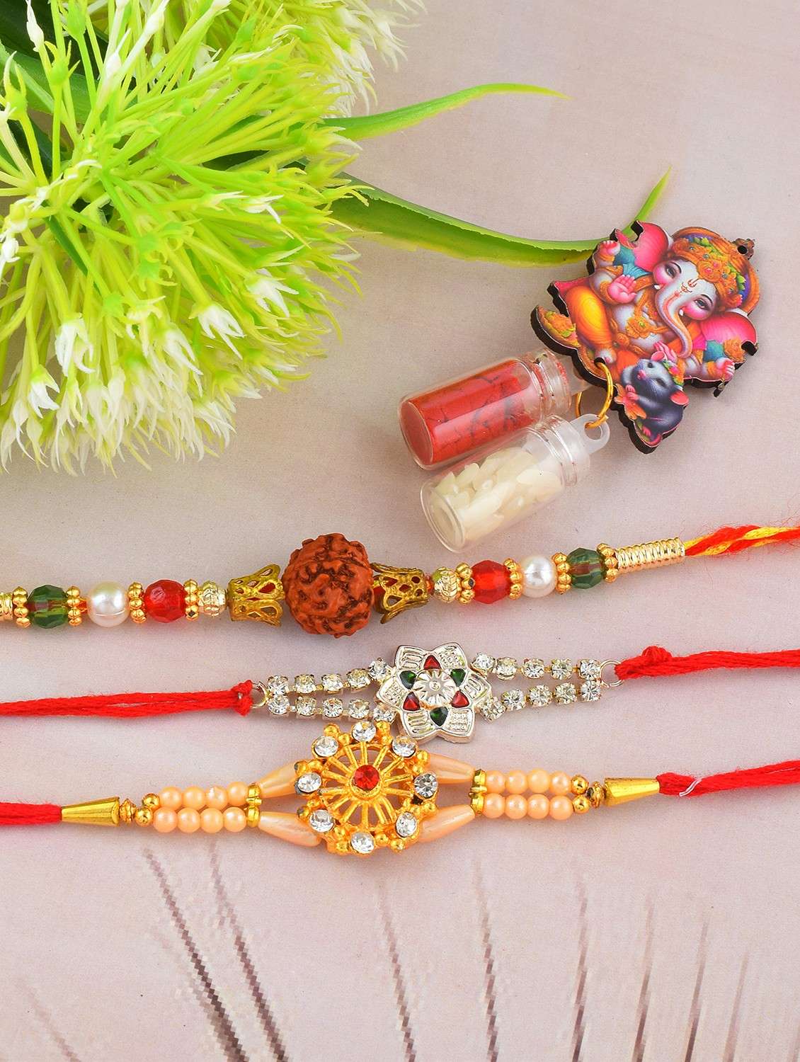 Rakhi for Bhaiya Bhabhi- Brass Micron Gold plated, One Pure Silver with one Rudraksh (Pack of 3)