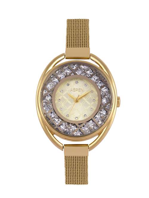 - » aspen fashionable analogue mesh strap ladies stainless steel gold color watch made from mineral crystal glass