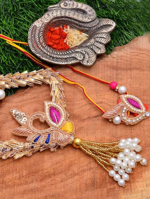 Gold Stone Studed Thread Work Designer Bhaiya bhabhi Lumba Rakhi set
