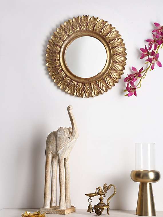 - » hand crafted beautiful design round mango wood mirror with gold foil