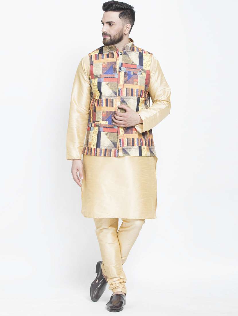 - » beige solid silk blend kurta pyjama set with yellow printed nehru jacket