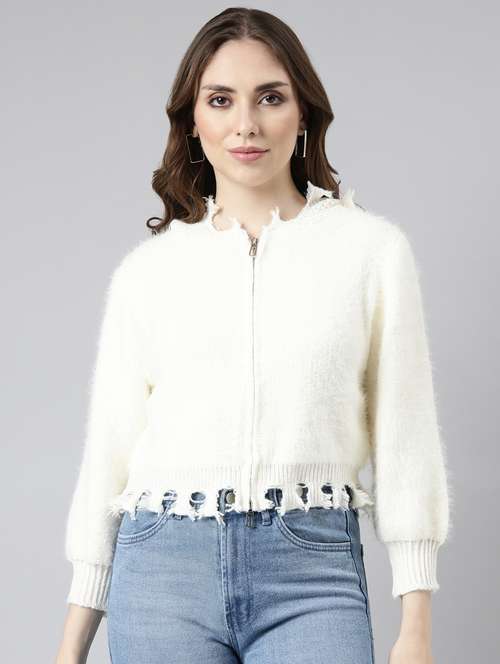 SHOWOFF Women's Long Sleeves Hood Solid Cream Crop Cardigan