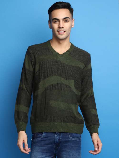 olive green self design v-neck pullover