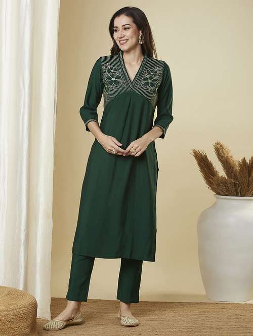 - Find gorgeous sets of ethnic wears in trending designs in green colors suitable for festive wear of occasions.