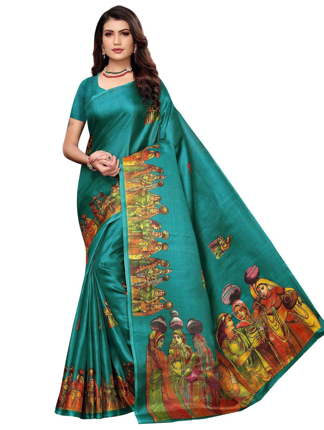 - » teal colored printed saree with blouse