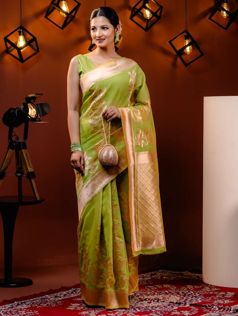 Green color Traditional Saree, With Woven Zari design All over , Has Zari woven border and pallu and Tussel Work at the end , Comes With Green Color Running Unstiched Blouse (Included In sarees Length 5.40 Mtr .80 Cm)
