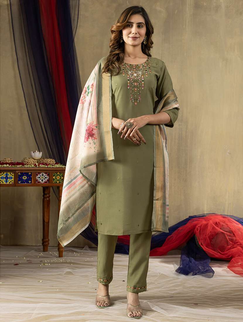 • Find gorgeous sets of ethnic wears in trending designs in olive colors suitable for festive wear of occasions.