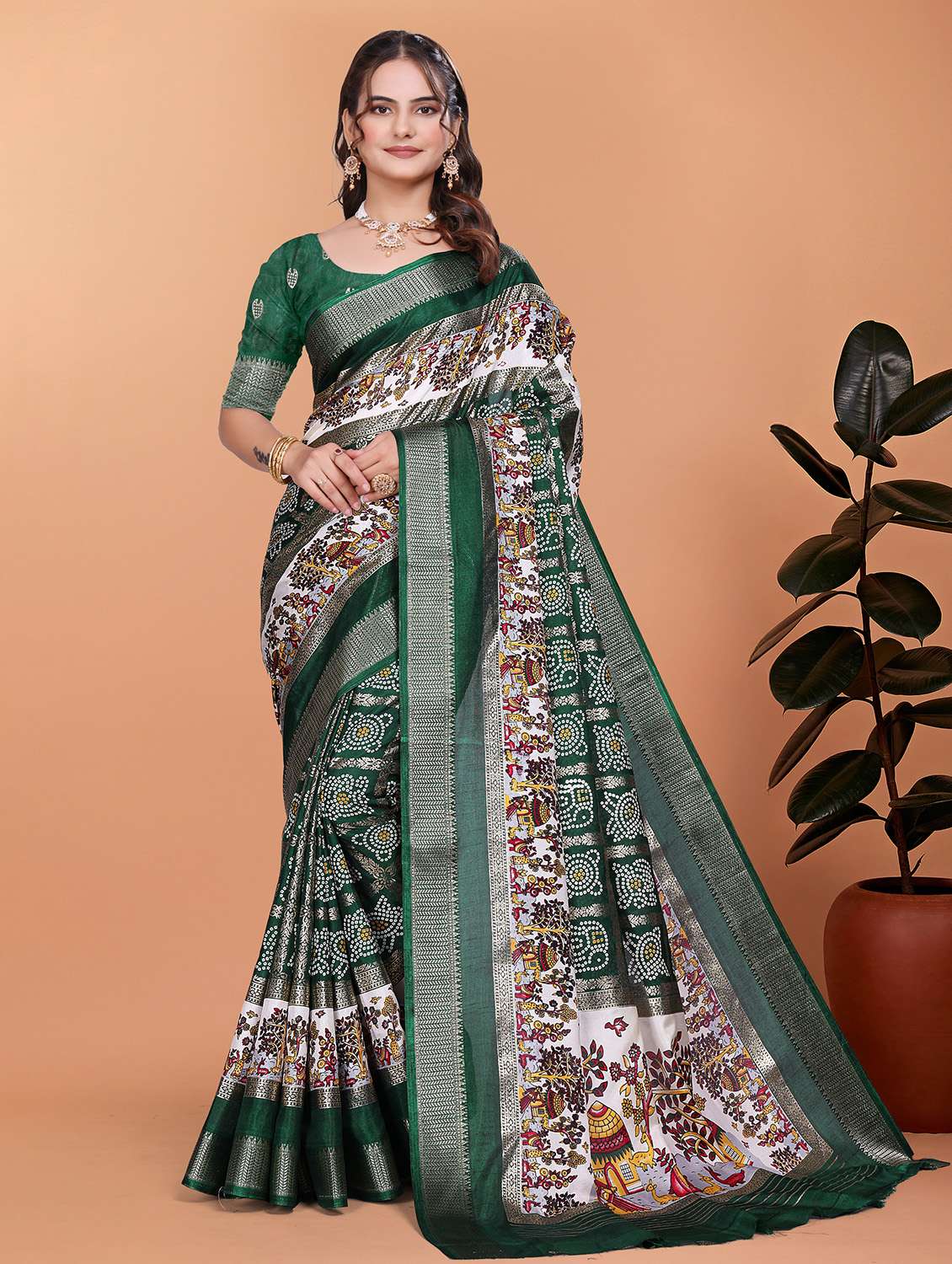 - » women bandhani printed bordered saree with blouse