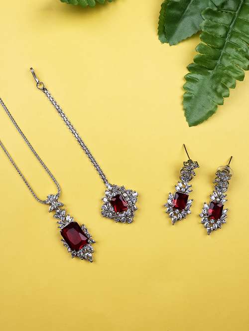 - » silver plated green square ad cz studded leaf pendant set