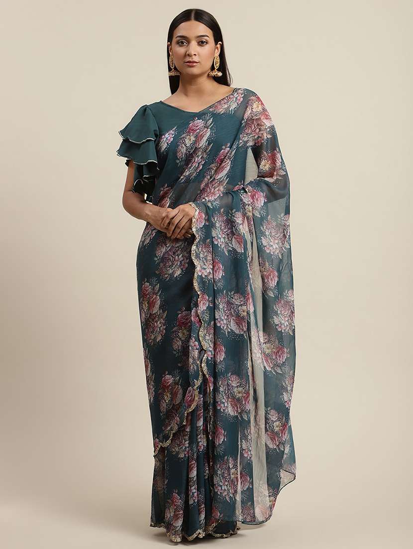 - » teal zari bordered floral saree with blouse