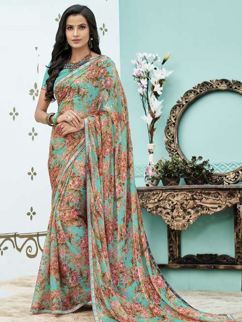 floral printed turquoise saree with blouse