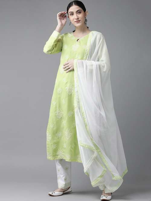 ada hand embroidered green/white cotton lucknowi chikankari unstitched suit piece	 - 18172883 - Very Small Image - 1