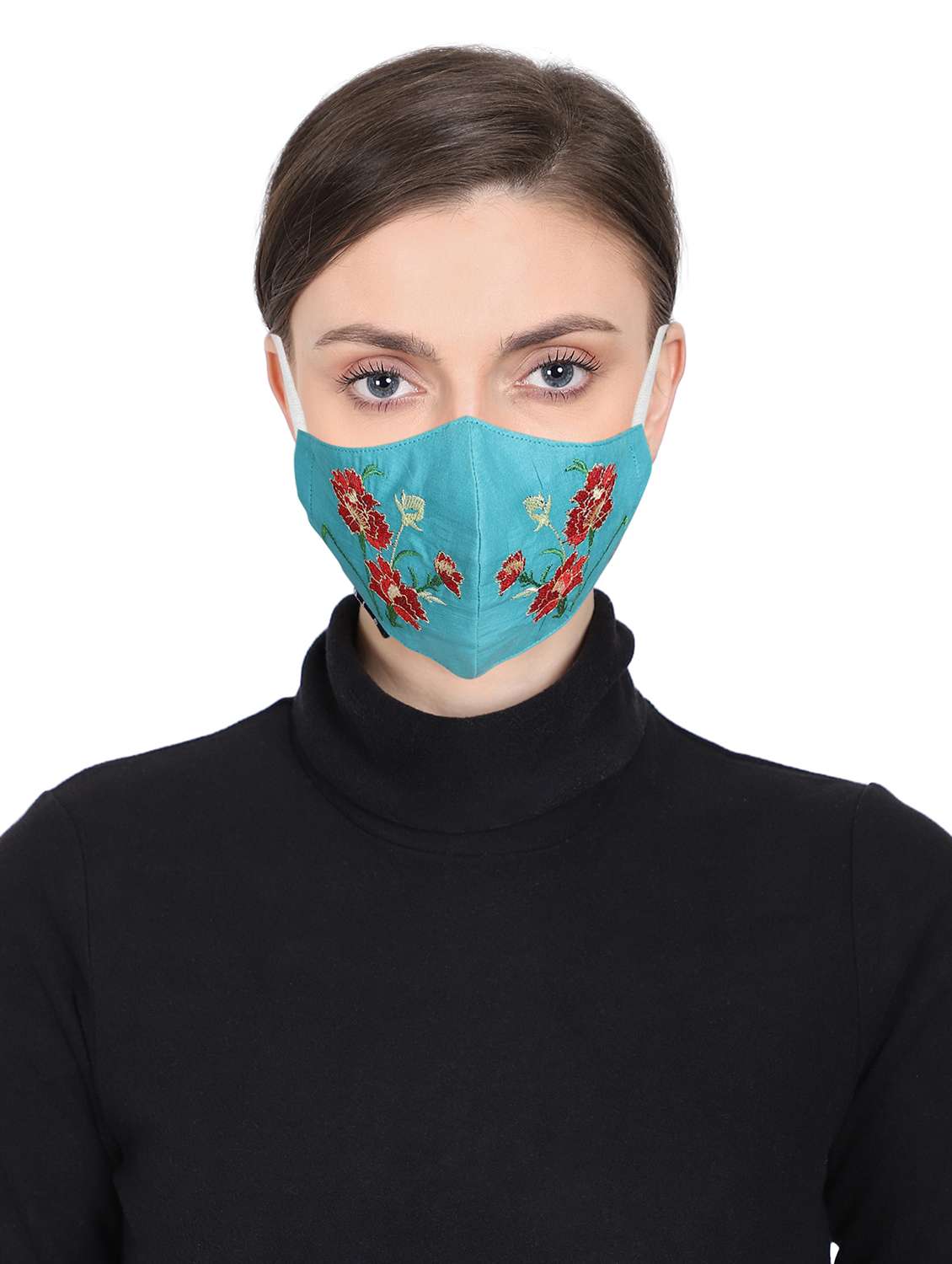 Anekaant 3-Ply Reusable Teal Green & Multi Floral Embroidered Cotton Fabric Fashion Mask