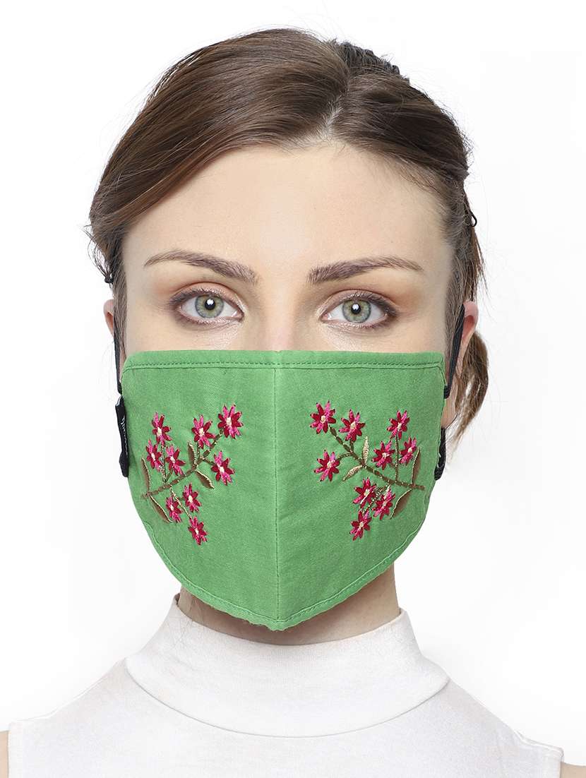 Anekaant 3-Ply Green & Pink Cotton Floral Embroidered Fabric Fashion Mask