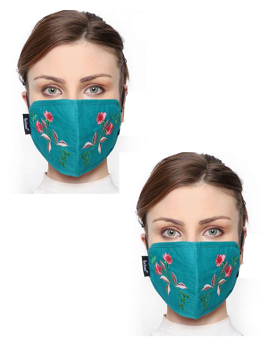 Anekaant Pack of 2 Turquoise & Multi 3-Ply Cotton Floral Embroidered Fabric Fashion Mask