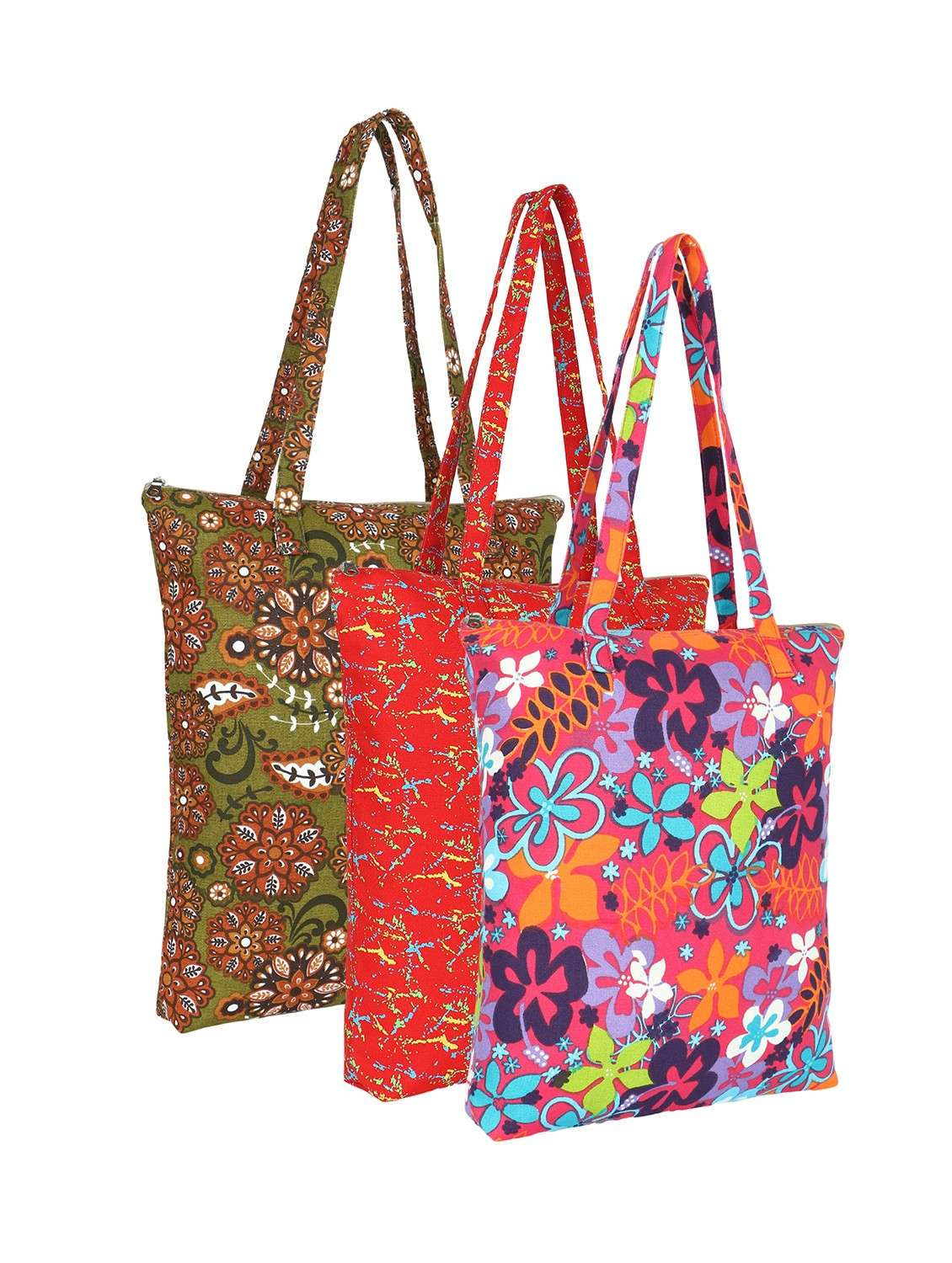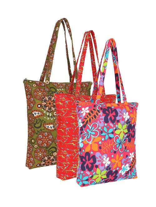Pack of Three Multicolor Shopping Bags from Anekaant's Eco-Friendly Collection. Crafted with Cotton Canvas fabric, these Shoulder Bags feature a Floral Printed Pattern. The Bags have 1 main compartment secured with a Zip closure and include 1 Inner Zip Pocket. The Two Handles make it convenient to carry the Bag around all day. Dimensions (LxHxW) : 38 x 42 x 5 cm. Say no to plastic bags and opt for these eco-friendly, reusable alternatives. Durable, stylish, and environmentally conscious, these bags help reduce waste while offering convenience for your everyday needs.