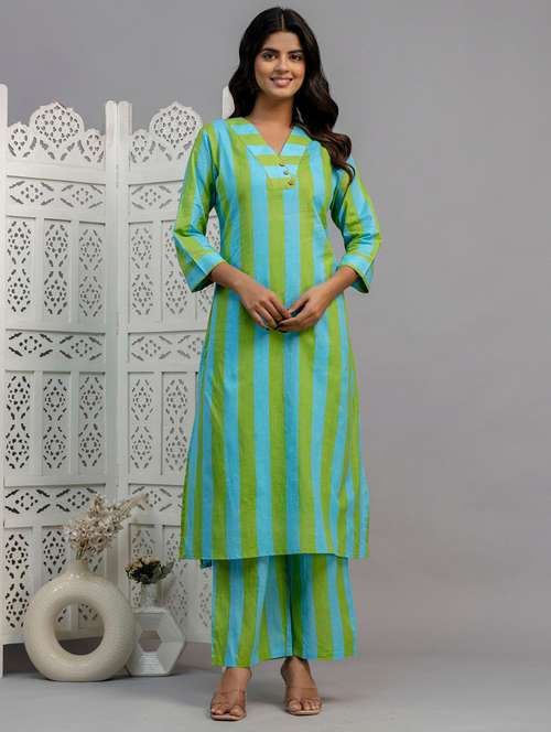 women striped three quarter sleeve kurta palazzo set