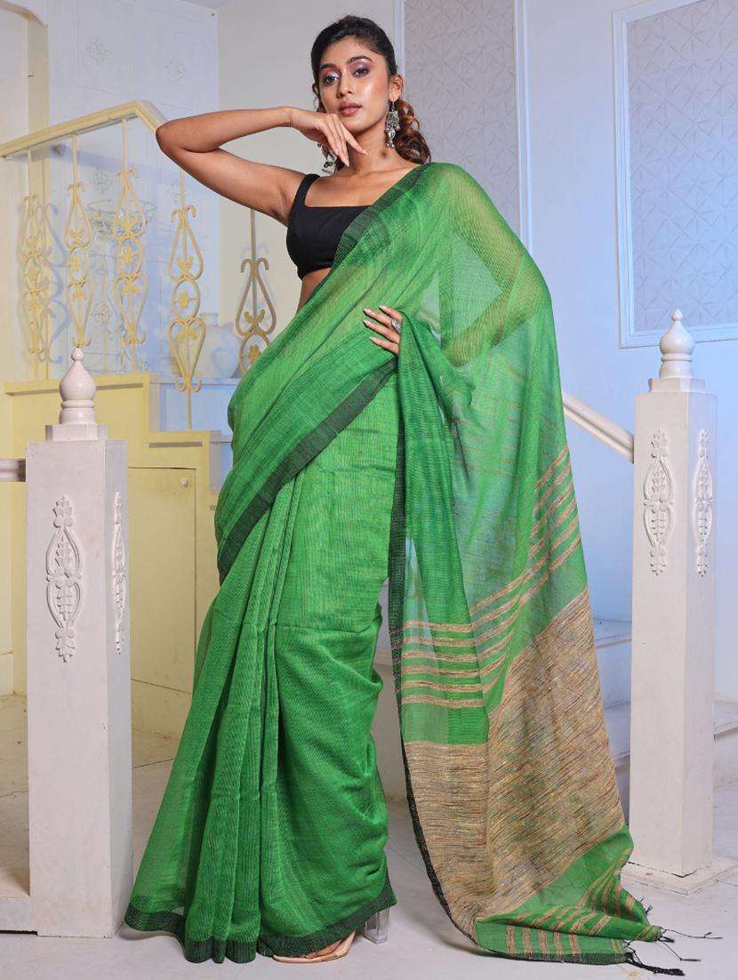 Drape a piece of beauty in this green cotton blend handwoven saree. It has solid body with simplicity. The pallu has gheecha patterns to compliments the look.