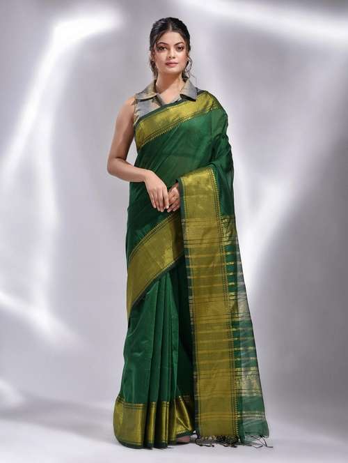 Look glamorous and alluring in this red matka silk handwoven saree. It has plain all over with zari and the borders have geometric patterns.