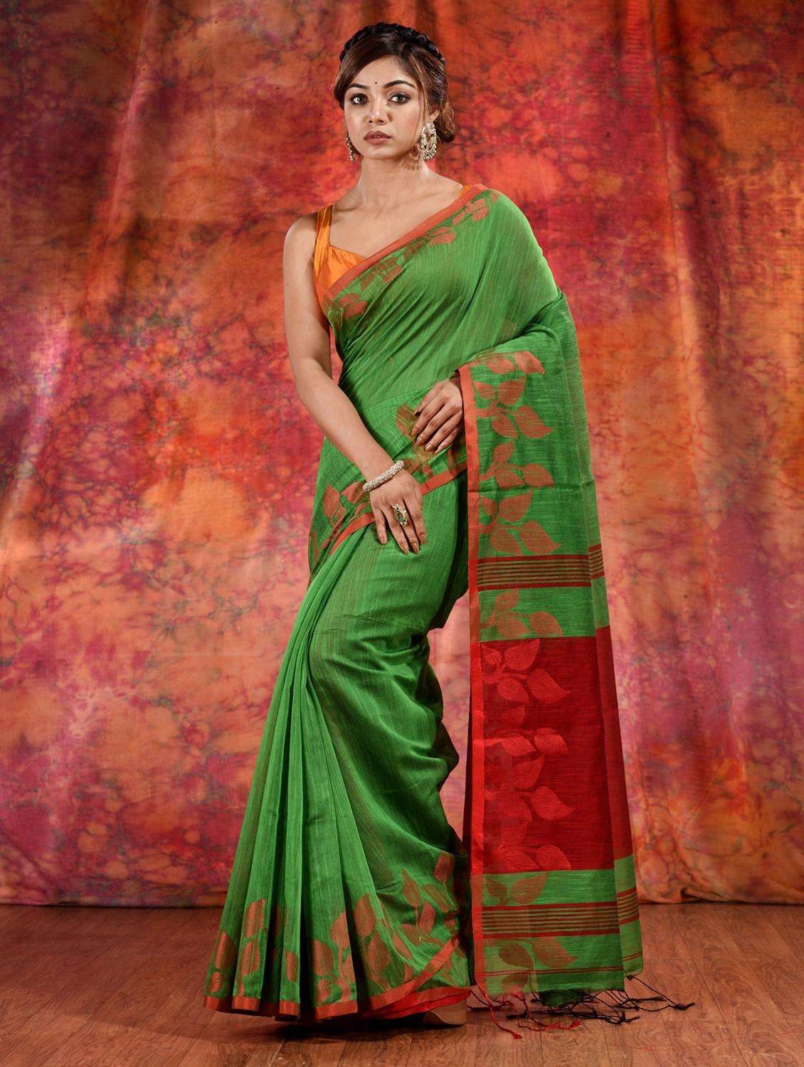 Look glamorous and alluring in this red matka silk handwoven saree. It has plain all over with zari and the borders have geometric patterns.