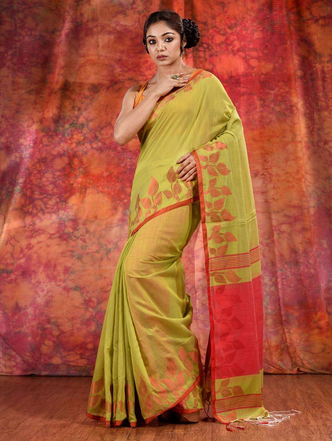 Look glamorous and alluring in this red matka silk handwoven saree. It has plain all over with zari and the borders have geometric patterns.
