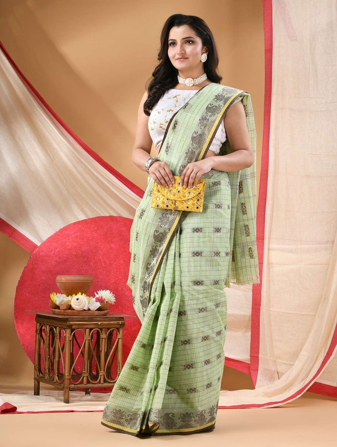 Celebrate tradition with this Tant cotton handloom saree, a graceful blend of heritage craftsmanship and modern style. Soft, lightweight, and breathable, it offers the comfort of pure cotton with the elegant drape of georgette and chiffon, making it perfect for weddings, festivals, functions, or office wear.