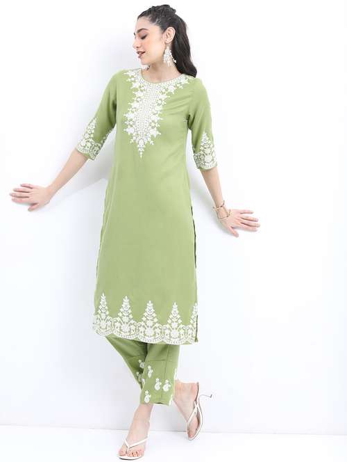 - Find gorgeous sets of ethnic wears in trending designs in green colors suitable for casual wear of occasions.