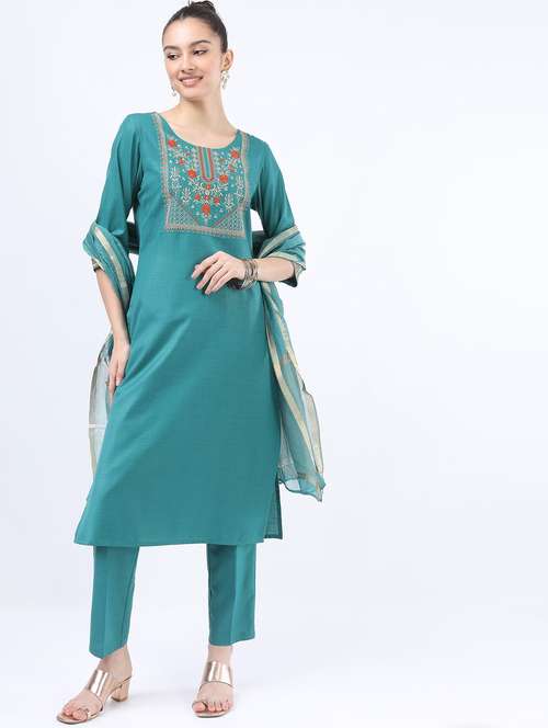 - Find gorgeous sets of ethnic wears in trending designs in turquoise colors suitable for casual wear of occasions.