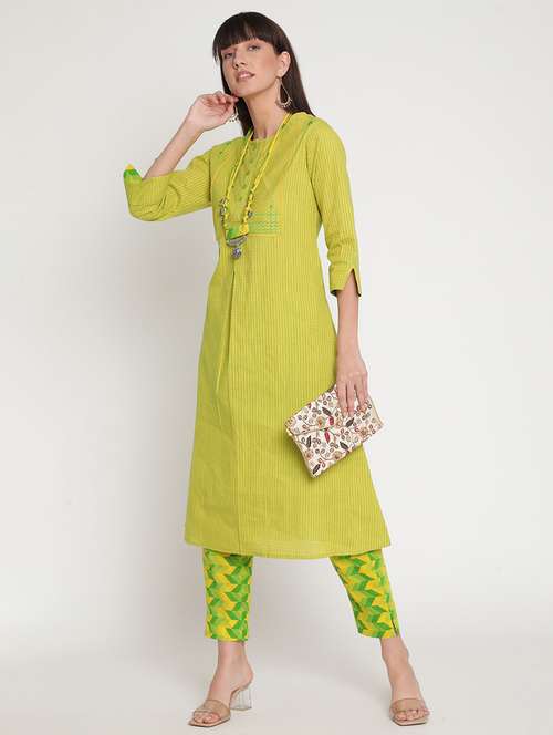 green cotton blend kurta pant set