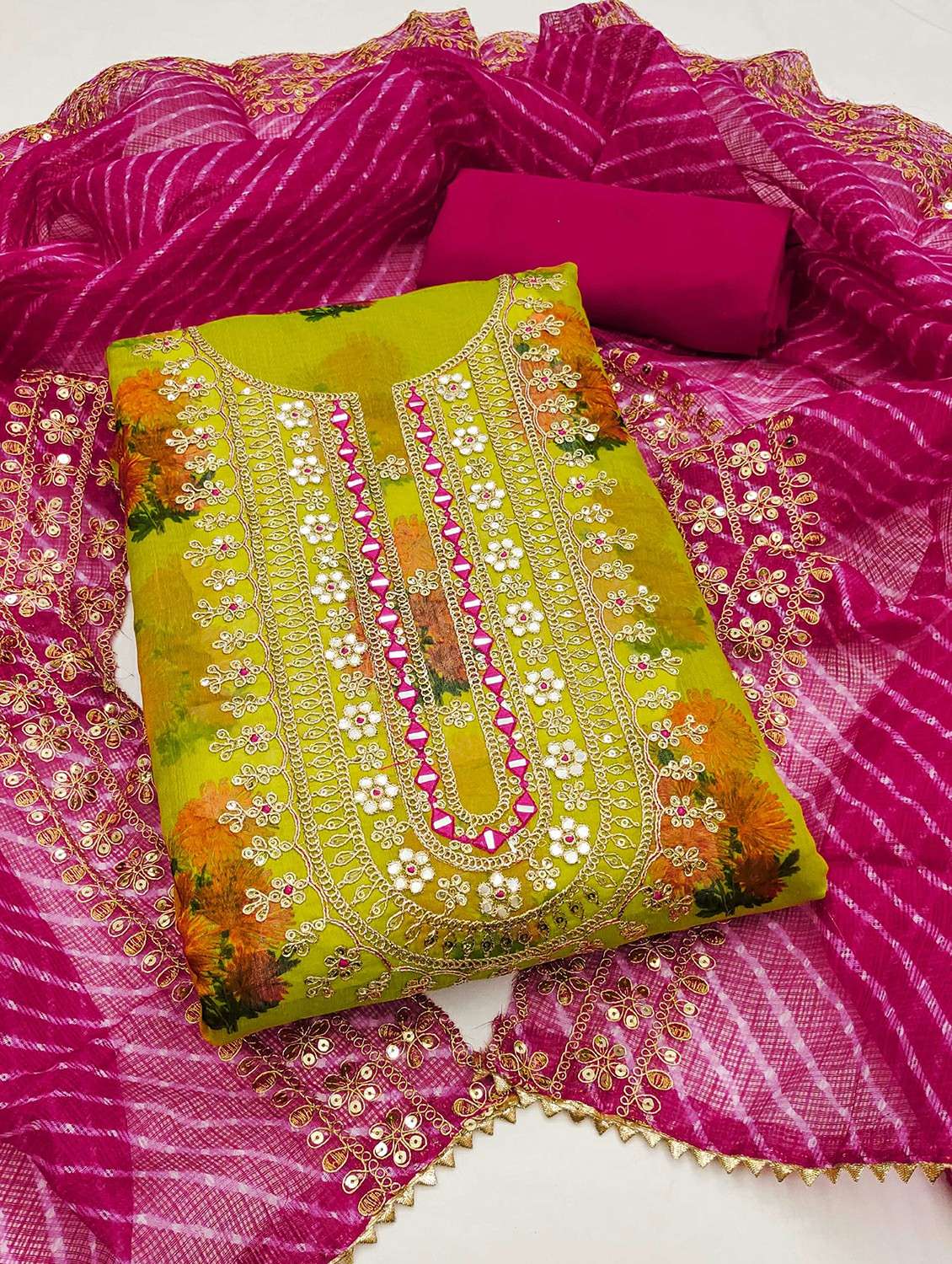 - Look ultra gorgeous in unstitched suits from Leeli Peeri Designer and grab these beautiful suits in lime colour.