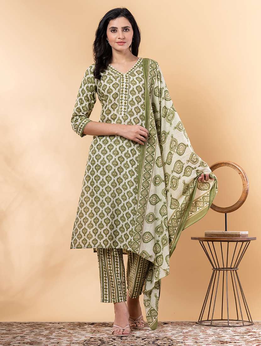 - Find gorgeous sets of ethnic wears in trending designs in green colors suitable for casual wear of occasions.