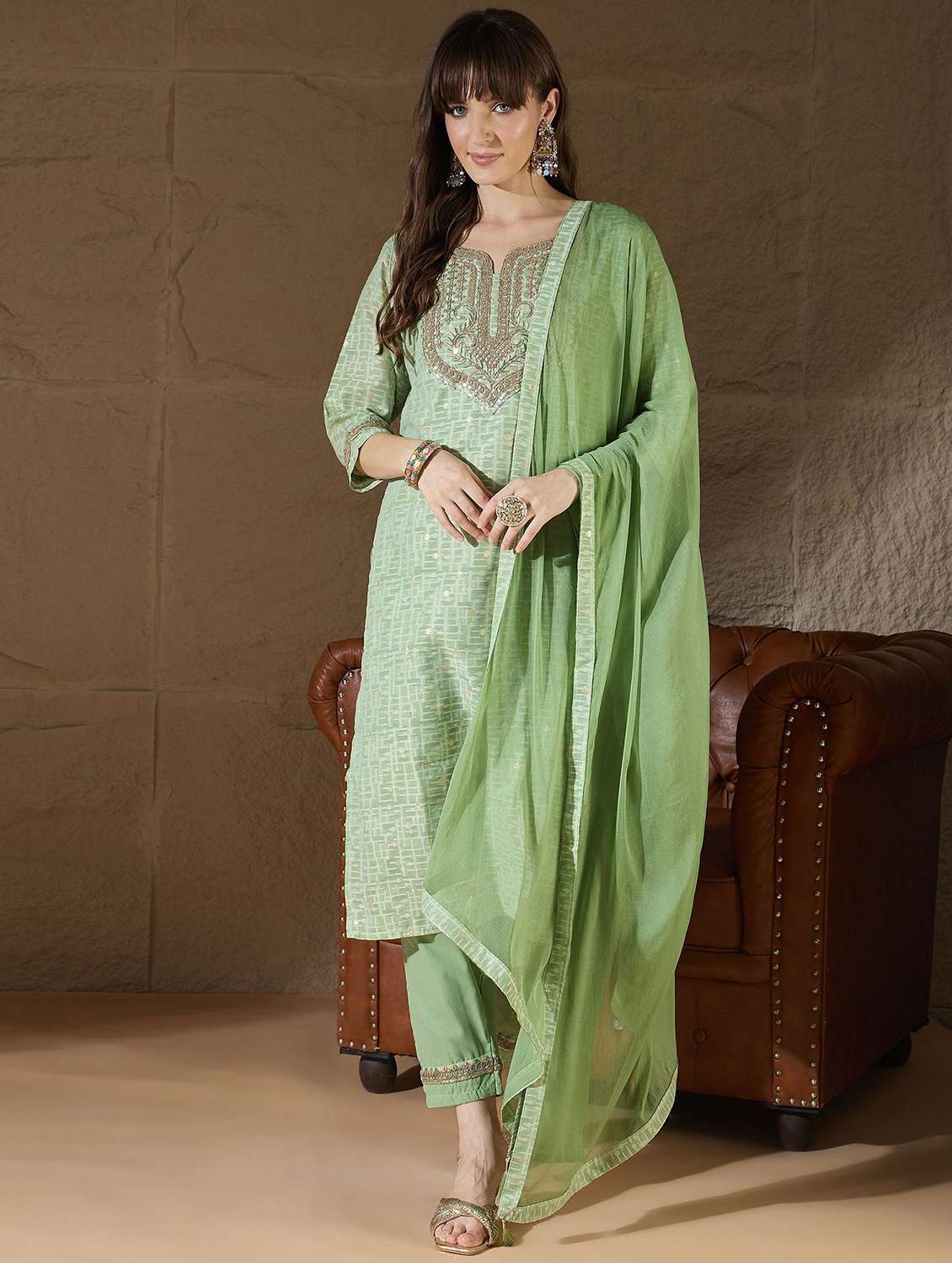 • Find gorgeous sets of ethnic wears in trending designs in green colors suitable for casual wear of occasions.