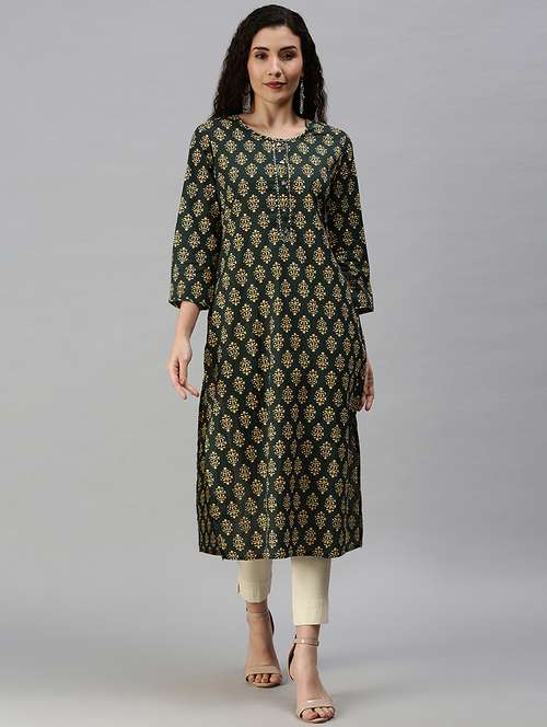 - Grab this beautiful kurta made up of cotton blend fabric featuring round neck designs.