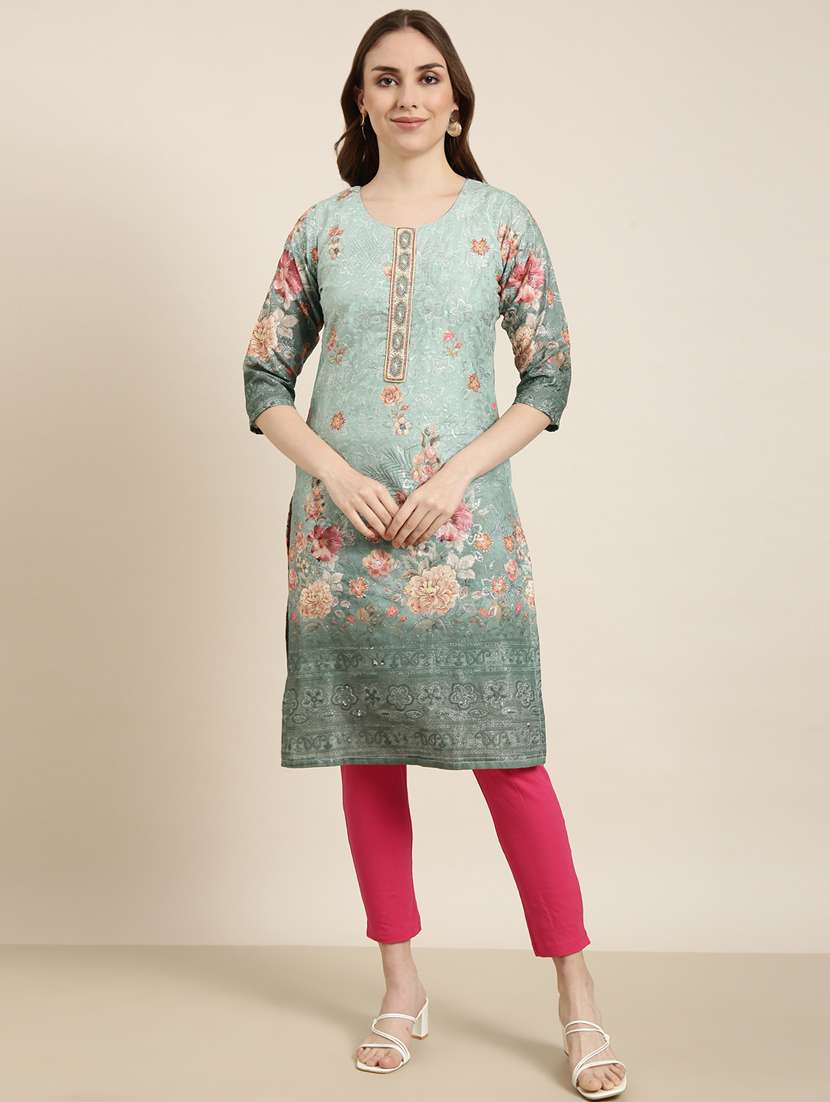 - Grab this beautiful kurta made up of cotton blend fabric featuring round neck designs.