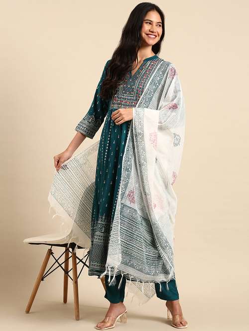 - Find gorgeous sets of ethnic wears in trending designs in teal colors suitable for festive wear of occasions.