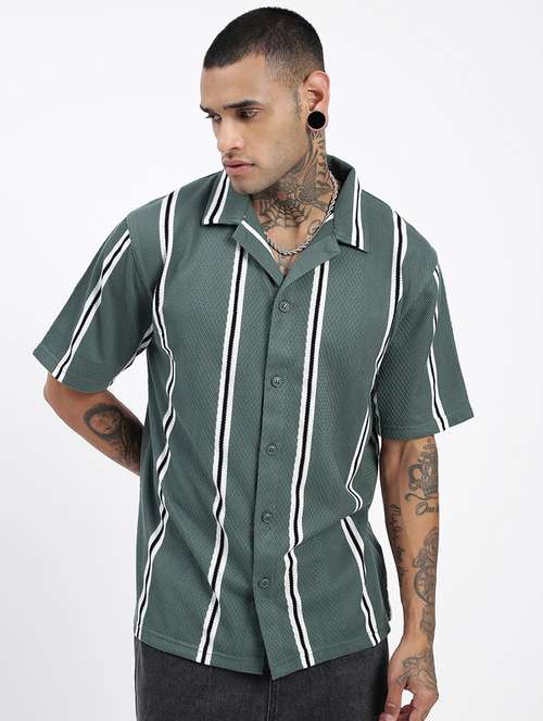 men loose fit striped cuban collar casual shirt