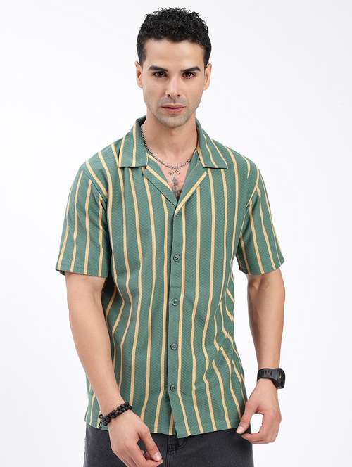 men loose fit striped cuban collar casual shirt
