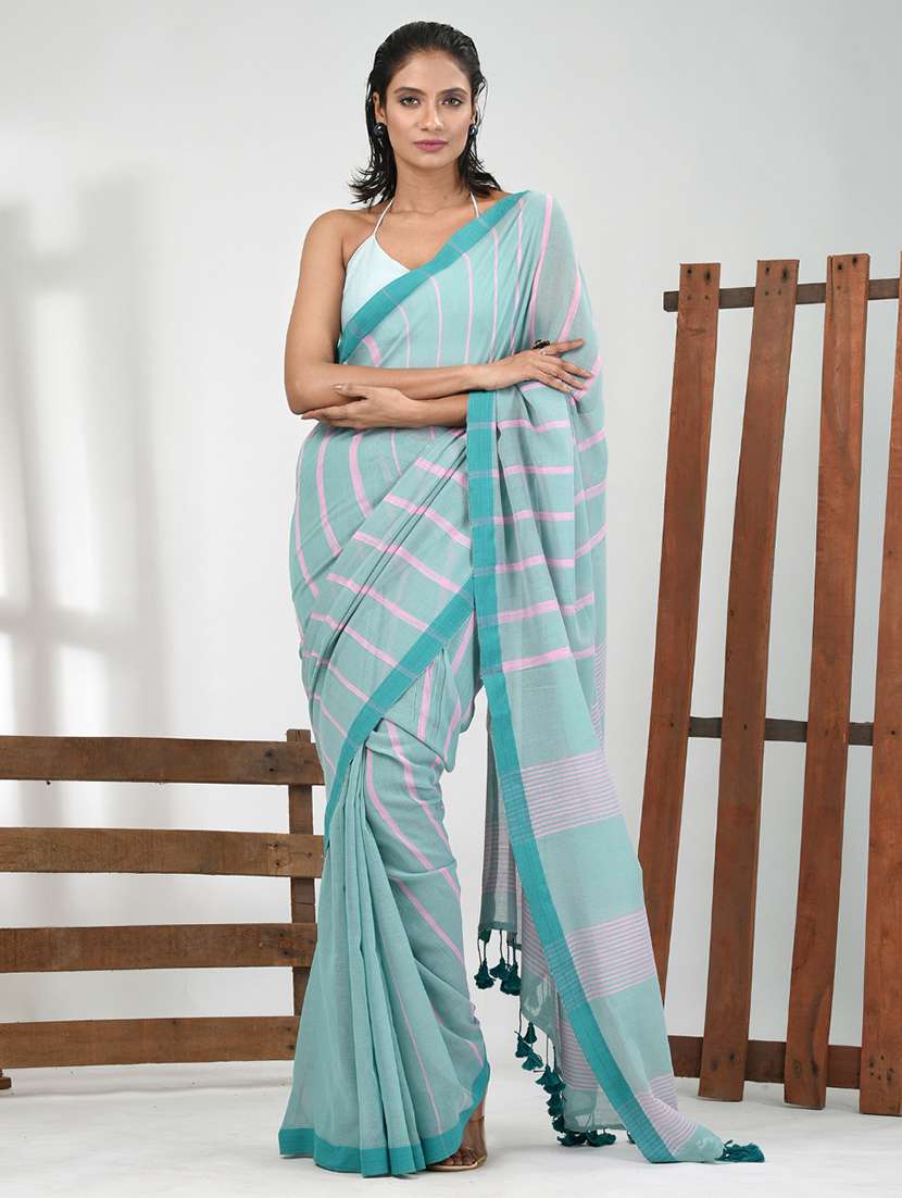Indulge in sophisticated comfort with Light blue Cotton Soft Saree With Stripe Pattern, a fusion of softness and elegance. Combine it with a stylish blouse for a modern touch or enhance it with statement jewelry for a touch of glamour.