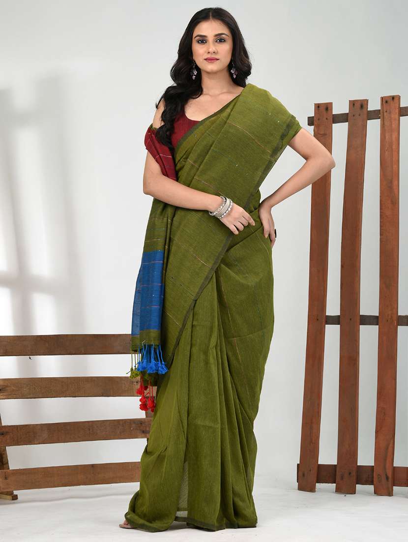 Indulge in sophisticated comfort with Green Stripe Cotton Soft Saree With Sequins, a fusion of softness and elegance. Combine it with a stylish blouse for a modern touch or enhance it with statement jewelry for a touch of glamour.
