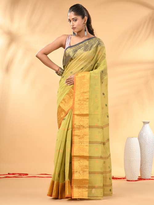 Embrace effortless elegance with this Pastel Green Tant cotton saree, delicately woven by Bengal's skilled artisans. The saree features a stunning combination of golden zari borders, highlighted with intricate motifs on the pallu. Scattered resham butis in shades of orange and green add a subtle charm to the body. Lightweight and breathable, this saree is perfect for daytime functions, festive occasions, or elegant everyday wear.