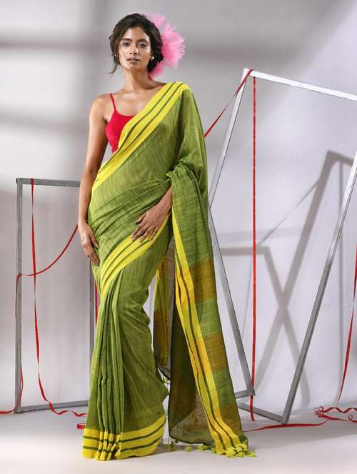 Look royal and loving in this green cotton soft saree. It has woven designs and patterns for a beautiful look.