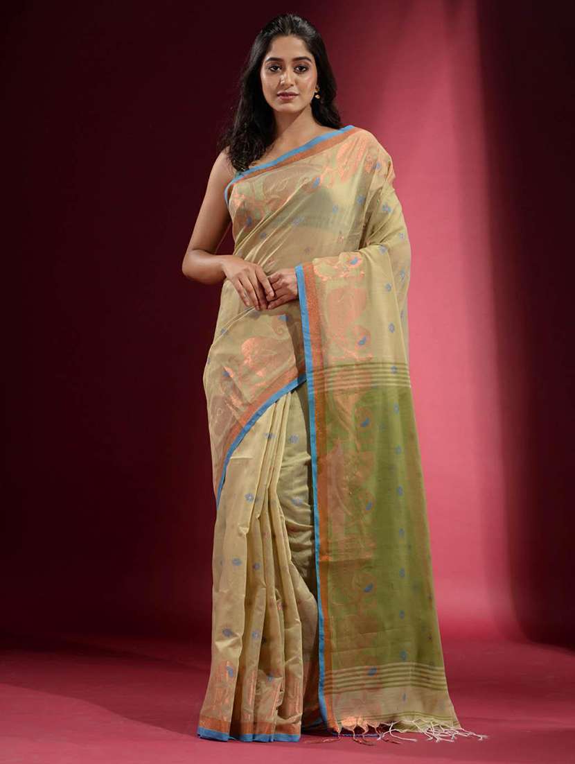 Get a splash of fresh hues in this olive green blended cotton handwoven saree. It has small floral motifs woven all over. The borders have paisley and leaf patterns woven along the length. The pallu is highlighted in sap green for a complete look.