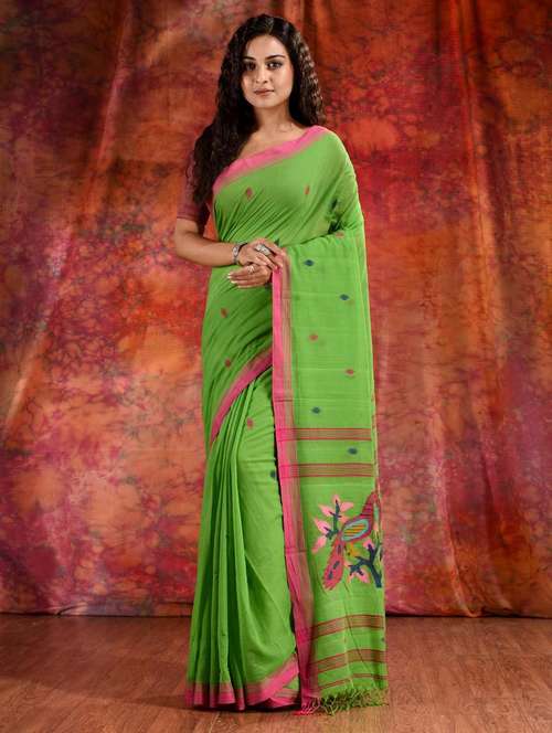 Look glamorous and alluring in this red matka silk handwoven saree. It has plain all over with zari and the borders have geometric patterns.