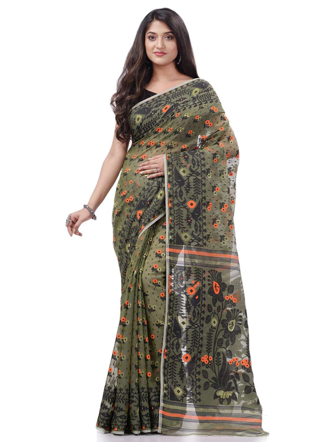 women's self design olive colored saree with blouse